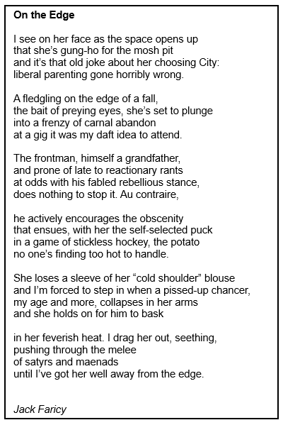 Jack Faricy is a teacher and poet based in Slaithwaite, West Yorkshire. He regularly attends workshops with Huddersfield’s Albert Poets. His poems have won prizes and appeared in magazines. Jack’s debut collection, ‘Traces’, is published by Calder Valley Poetry. He is currently working on a PhD project, which is a poetic exploration of the M62 and the landscapes it connects.
